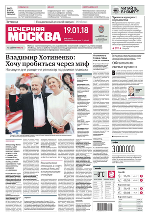 «Вечерняя Москва» — ежедневная российская вечерняя газета, старейшее из вечерних изданий в России, учрежденное в 1923 году. Выходит пять дней в неделю, кроме субботы и воскресенья. Отличается тем, что рассказывает о событиях еще не завершившегося дня. Оперативно освещает хронику и особенности жизни Москвы, охватывает все слои общества и большинство профессиональных и возрастных групп читателей.Издание представлено тремя выпусками – утренним ежедневным, вечерним (выходит три раза в неделю), еженедельным (выходит по четвергам).