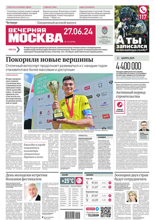 «Вечерняя Москва» — ежедневная российская вечерняя газета, старейшее из вечерних изданий в России, учрежденное в 1923 году. Выходит пять дней в неделю, кроме субботы и воскресенья. Отличается тем, что рассказывает о событиях еще не завершившегося дня. Оперативно освещает хронику и особенности жизни Москвы, охватывает все слои общества и большинство профессиональных и возрастных групп читателей.Издание представлено тремя выпусками – утренним ежедневным, вечерним (выходит три раза в неделю), еженедельным (выходит по четвергам).