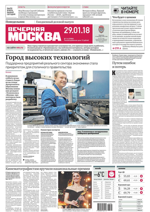 «Вечерняя Москва» — ежедневная российская вечерняя газета, старейшее из вечерних изданий в России, учрежденное в 1923 году. Выходит пять дней в неделю, кроме субботы и воскресенья. Отличается тем, что рассказывает о событиях еще не завершившегося дня. Оперативно освещает хронику и особенности жизни Москвы, охватывает все слои общества и большинство профессиональных и возрастных групп читателей.Издание представлено тремя выпусками – утренним ежедневным, вечерним (выходит три раза в неделю), еженедельным (выходит по четвергам).