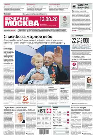 «Вечерняя Москва» — ежедневная российская вечерняя газета, старейшее из вечерних изданий в России, учрежденное в 1923 году. Выходит пять дней в неделю, кроме субботы и воскресенья. Отличается тем, что рассказывает о событиях еще не завершившегося дня. Оперативно освещает хронику и особенности жизни Москвы, охватывает все слои общества и большинство профессиональных и возрастных групп читателей.Издание представлено тремя выпусками – утренним ежедневным, вечерним (выходит три раза в неделю), еженедельным (выходит по четвергам).