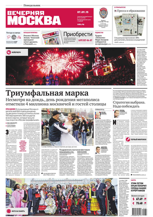 Еженедельный выпуск «Вечерней Москвы» — это значимые события недели, афиша города, новости из сферы отдыха и развлечений, телепрограмма с анонсами и комментариями, авторские колонки журналистов и авторитетные мнения экспертов, детская страничка, специальная рубрика «Золушка», интересные репортажи о необычных судьбах московских жителей, постоянные конкурсы и викторины.