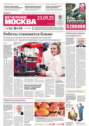 «Вечерняя Москва» — ежедневная российская вечерняя газета, старейшее из вечерних изданий в России, учрежденное в 1923 году. Выходит пять дней в неделю, кроме субботы и воскресенья. Отличается тем, что рассказывает о событиях еще не завершившегося дня. Оперативно освещает хронику и особенности жизни Москвы, охватывает все слои общества и большинство профессиональных и возрастных групп читателей.Издание представлено тремя выпусками – утренним ежедневным, вечерним (выходит три раза в неделю), еженедельным (выходит по четвергам).