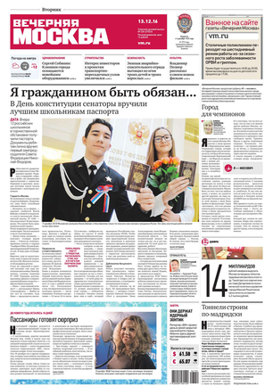 «Вечерняя Москва» — ежедневная российская вечерняя газета, старейшее из вечерних изданий в России, учрежденное в 1923 году. Выходит пять дней в неделю, кроме субботы и воскресенья. Отличается тем, что рассказывает о событиях еще не завершившегося дня. Оперативно освещает хронику и особенности жизни Москвы, охватывает все слои общества и большинство профессиональных и возрастных групп читателей.Издание представлено тремя выпусками – утренним ежедневным, вечерним (выходит три раза в неделю), еженедельным (выходит по четвергам).