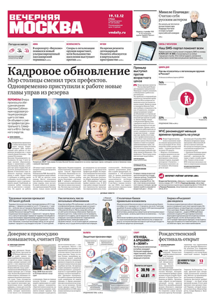 «Вечерняя Москва» — ежедневная российская вечерняя газета, старейшее из вечерних изданий в России, учрежденное в 1923 году. Выходит пять дней в неделю, кроме субботы и воскресенья. Отличается тем, что рассказывает о событиях еще не завершившегося дня. Оперативно освещает хронику и особенности жизни Москвы, охватывает все слои общества и большинство профессиональных и возрастных групп читателей.Издание представлено тремя выпусками – утренним ежедневным, вечерним (выходит три раза в неделю), еженедельным (выходит по четвергам).