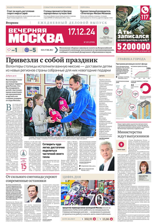 «Вечерняя Москва» — ежедневная российская вечерняя газета, старейшее из вечерних изданий в России, учрежденное в 1923 году. Выходит пять дней в неделю, кроме субботы и воскресенья. Отличается тем, что рассказывает о событиях еще не завершившегося дня. Оперативно освещает хронику и особенности жизни Москвы, охватывает все слои общества и большинство профессиональных и возрастных групп читателей.Издание представлено тремя выпусками – утренним ежедневным, вечерним (выходит три раза в неделю), еженедельным (выходит по четвергам).