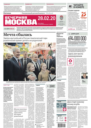 «Вечерняя Москва» — ежедневная российская вечерняя газета, старейшее из вечерних изданий в России, учрежденное в 1923 году. Выходит пять дней в неделю, кроме субботы и воскресенья. Отличается тем, что рассказывает о событиях еще не завершившегося дня. Оперативно освещает хронику и особенности жизни Москвы, охватывает все слои общества и большинство профессиональных и возрастных групп читателей.Издание представлено тремя выпусками – утренним ежедневным, вечерним (выходит три раза в неделю), еженедельным (выходит по четвергам).