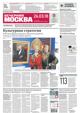 «Вечерняя Москва» — ежедневная российская вечерняя газета, старейшее из вечерних изданий в России, учрежденное в 1923 году. Выходит пять дней в неделю, кроме субботы и воскресенья. Отличается тем, что рассказывает о событиях еще не завершившегося дня. Оперативно освещает хронику и особенности жизни Москвы, охватывает все слои общества и большинство профессиональных и возрастных групп читателей.Издание представлено тремя выпусками – утренним ежедневным, вечерним (выходит три раза в неделю), еженедельным (выходит по четвергам).