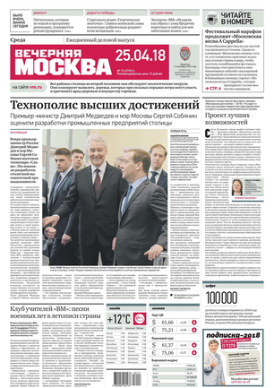 «Вечерняя Москва» — ежедневная российская вечерняя газета, старейшее из вечерних изданий в России, учрежденное в 1923 году. Выходит пять дней в неделю, кроме субботы и воскресенья. Отличается тем, что рассказывает о событиях еще не завершившегося дня. Оперативно освещает хронику и особенности жизни Москвы, охватывает все слои общества и большинство профессиональных и возрастных групп читателей.Издание представлено тремя выпусками – утренним ежедневным, вечерним (выходит три раза в неделю), еженедельным (выходит по четвергам).