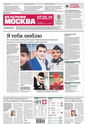 «Вечерняя Москва» — ежедневная российская вечерняя газета, старейшее из вечерних изданий в России, учрежденное в 1923 году. Выходит пять дней в неделю, кроме субботы и воскресенья. Отличается тем, что рассказывает о событиях еще не завершившегося дня. Оперативно освещает хронику и особенности жизни Москвы, охватывает все слои общества и большинство профессиональных и возрастных групп читателей.Издание представлено тремя выпусками – утренним ежедневным, вечерним (выходит три раза в неделю), еженедельным (выходит по четвергам).