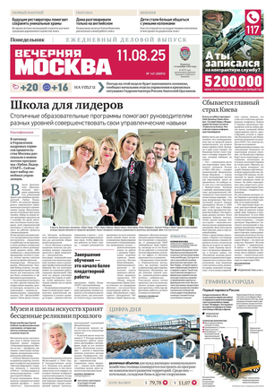 «Вечерняя Москва» — ежедневная российская вечерняя газета, старейшее из вечерних изданий в России, учрежденное в 1923 году. Выходит пять дней в неделю, кроме субботы и воскресенья. Отличается тем, что рассказывает о событиях еще не завершившегося дня. Оперативно освещает хронику и особенности жизни Москвы, охватывает все слои общества и большинство профессиональных и возрастных групп читателей.Издание представлено тремя выпусками – утренним ежедневным, вечерним (выходит три раза в неделю), еженедельным (выходит по четвергам).