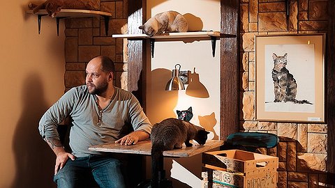 «Раньше я не был кошатником, а сейчас у меня дома живут восемь кошек», — рассказывает основатель кафе «Котики и люди» Владимир Кузин. Наш разговор за одним из столиков то и дело прерывает пушистый рыжий кот — запрыгивает на стол и требует внимания хозяина. Именно за общение с котами — помимо рыжего их тут еще 23 — платят посетители.