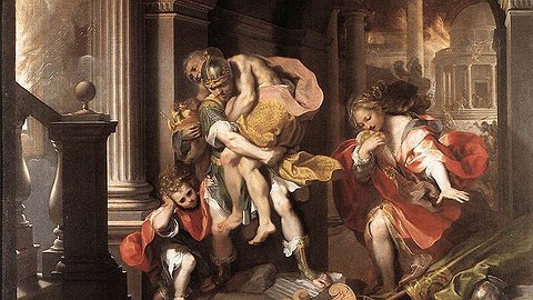 Сын богини Афродиты, храбрый воин Эней, сражался на Троянской войне, в доблести уступая среди троянцев лишь Гектору. Однако бесстрашия этих воинов оказалось недостаточно для победы. Не сумев одолеть троянцев в честном бою, греки прибегли к хитрости и захватили город. Эней со своим отцом, сыном и уцелевшими согражданами бежали из пылающей Трои, погрузились на корабли и пустились в долгое странствие.